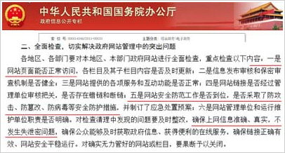 国务院办公厅发布通知,要求进一步加强政府网站管理工作,确保网站能正常访问,网站信息准确、真实,不发生泄密,时时做好防攻击、防篡改、放病毒等。可信网站四大防护功能保证网站安全运行。