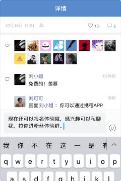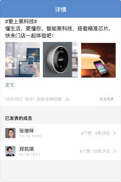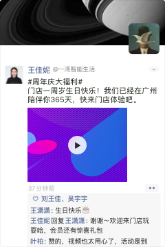 • 01客户看到发表到朋友圈的内容并点赞和评论,成员收到新消息后随时可回复评论