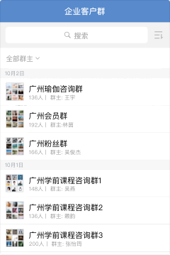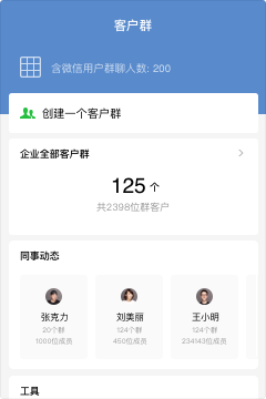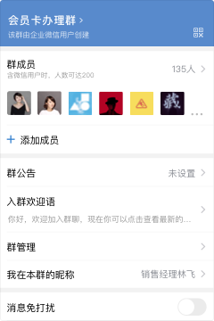 企业可查看并管理成员的客户群聊、对离职成员管理的群聊再分配。客户群人数可达200人