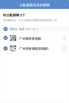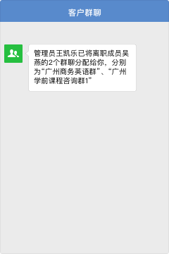• 02成员离职并从通讯录中被删除后,可以分配他的客户群给其他成员